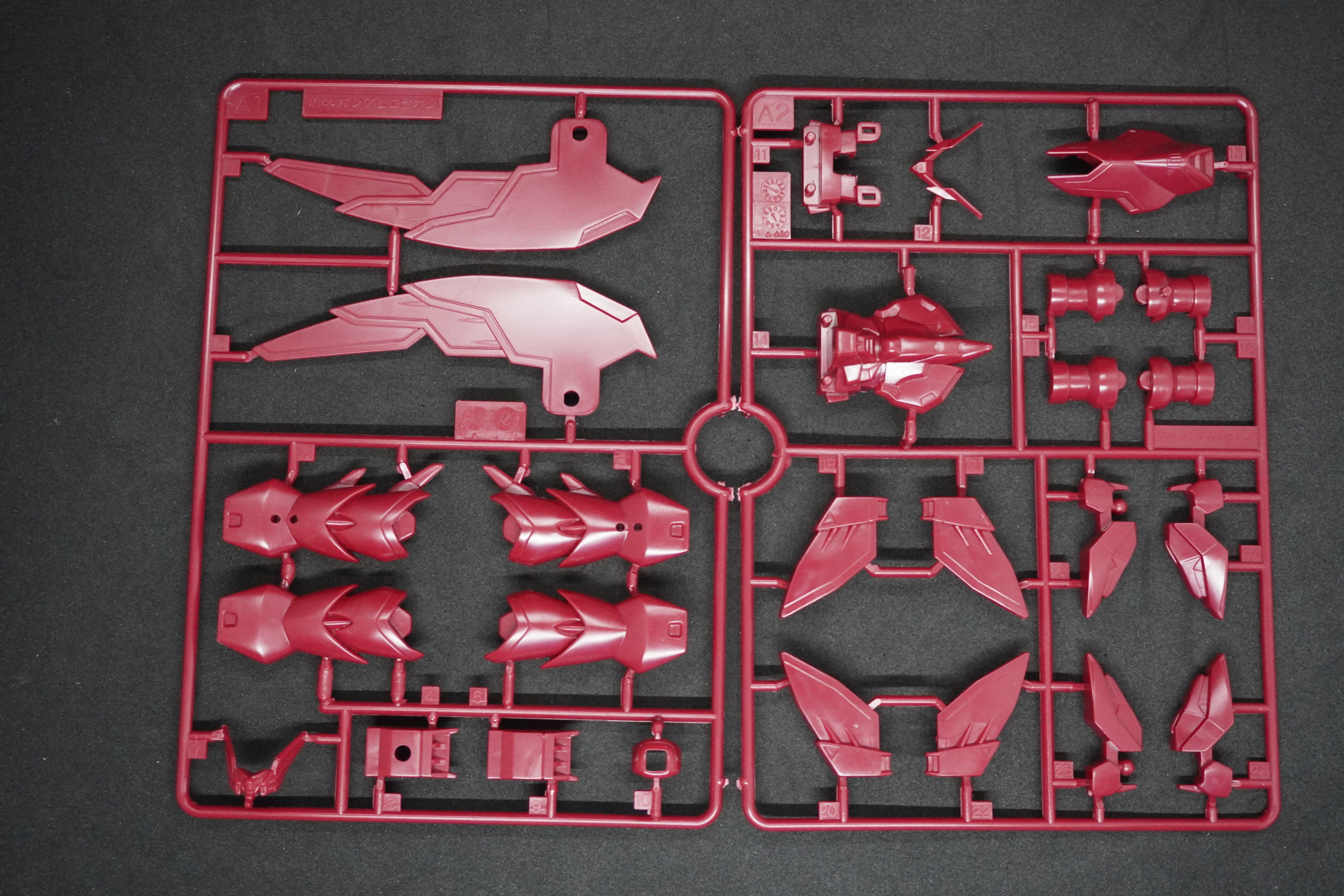 まず、ランナーは本体部2枚とポリキャップ1枚。シールと先ほど紹介したゼクスのフィギュアが入っています。成形職は赤と黒の2色。それをシールで補うような形になっております。フィギュアは組み立て不要ですが、アイボリーっぽい色の1色成型でシールなしです。